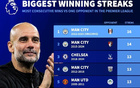 英超对同一球队最长连胜排行:曼城对富勒姆16连胜居首